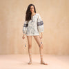 A fusion of tradition and modernity, the Lila Raglan Sleeve Top in ecru cotton features midnight blue fringe detailing, cutwork appliqué, katruan sleeves, and handcrafted tassels. The effortless silhouette lends a relaxed yet refined aesthetic.