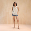 The Natalie Top crafted in off-white Katruan cotton and features a draped cowl neckline framed by subtle lace accents—offering sophistication with a touch of contemporary softness and minimalistic form.